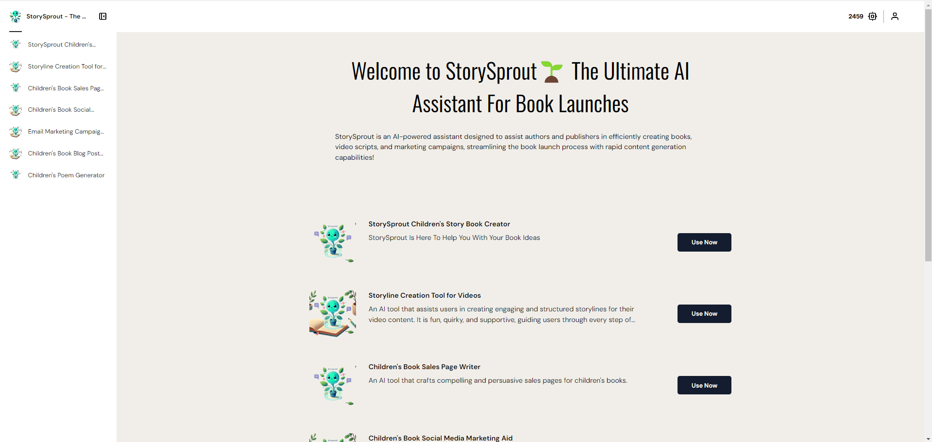 The ultimate AI assistant for authors! Create captivating children's books, craft irresistible sales pages, and boost your marketing with tailored social media content and video scripts. StorySprout isn't just AI; it's your creative partner, streamlining your book launch from start to finish.